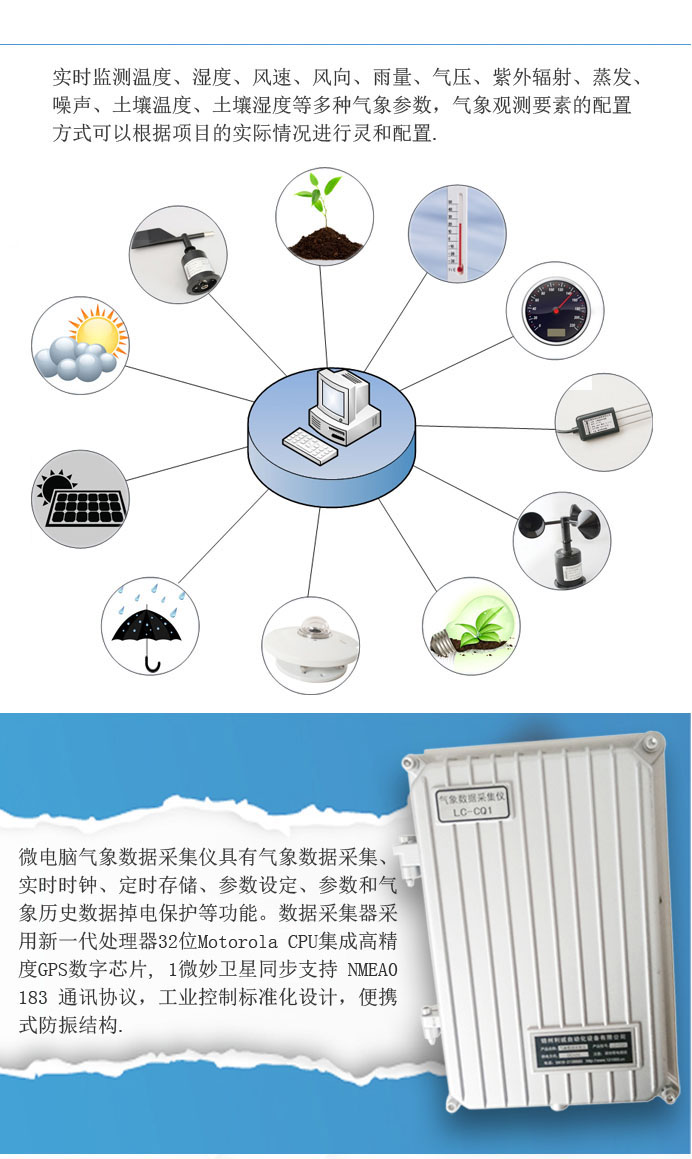 2、微電腦氣象數(shù)據(jù)采集儀具有氣象數(shù)據(jù)采集、實(shí)時(shí)時(shí)鐘、定時(shí)存儲(chǔ)、參數(shù)設(shè)定、參數(shù)和氣象歷史數(shù)據(jù)掉電保護(hù)等功能。數(shù)據(jù)采集器采用新一代處理器32位Motorola CPU集成高精度GPS數(shù)字芯片, 1微妙衛(wèi)星同步支持 NMEA0183 通訊協(xié)議,主動(dòng)型陶瓷天線讓定位更為精準(zhǔn),通過氣象監(jiān)測(cè)軟件可以準(zhǔn)確定位查看監(jiān)測(cè)區(qū)域的氣象環(huán)境數(shù)據(jù),方便于移動(dòng)觀測(cè)氣象數(shù)據(jù),工業(yè)控制標(biāo)準(zhǔn)化設(shè)計(jì),便攜式防振結(jié)構(gòu),漢字液晶鍵盤人機(jī)界面,使用先進(jìn)的雙屏顯示技術(shù),主屏顯示實(shí)時(shí)氣象數(shù)據(jù)信息,輔屏顯示地理狀況信息包括方位、高度、天氣預(yù)報(bào)資料等等,人機(jī)界面友好,便于現(xiàn)場實(shí)時(shí)查看氣象分析數(shù)據(jù),無需外接電腦終端設(shè)備。