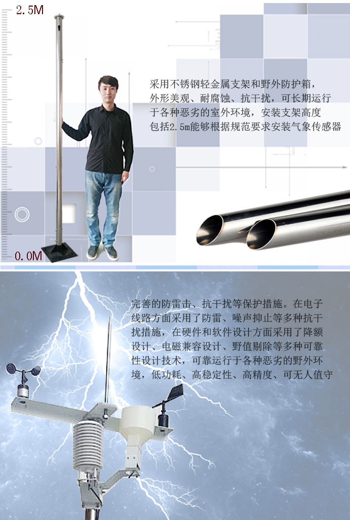 6、采用不銹鋼輕金屬支架和野外防護(hù)箱,外形美觀、耐腐蝕、抗干擾,可長期運(yùn)行于各種惡劣的室外環(huán)境,安裝支架高度包括2.5m能夠根據(jù)規(guī)范要求安裝氣象傳感器。